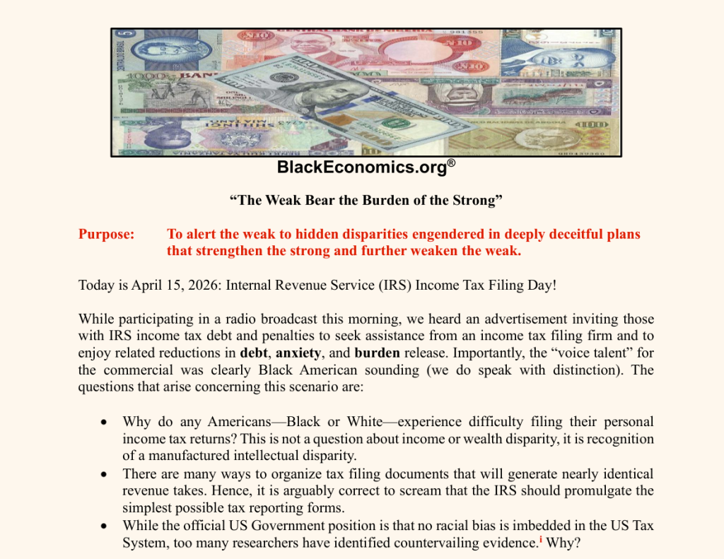 Yesterday’s April 15th “Tax Day” and today’s world of anomalies cloud and confuse expectations built on yesteryear with current realities that cause our world to appear upside down. Certain situations can cause us to conclude that our world seems inverted. This BlackEconomics.org brief essay entitled, “The Weak Bear the Burden of the Strong” is a case in point that serves as a perfect reminder that what is considered beautiful and rational often depends on the beholder.